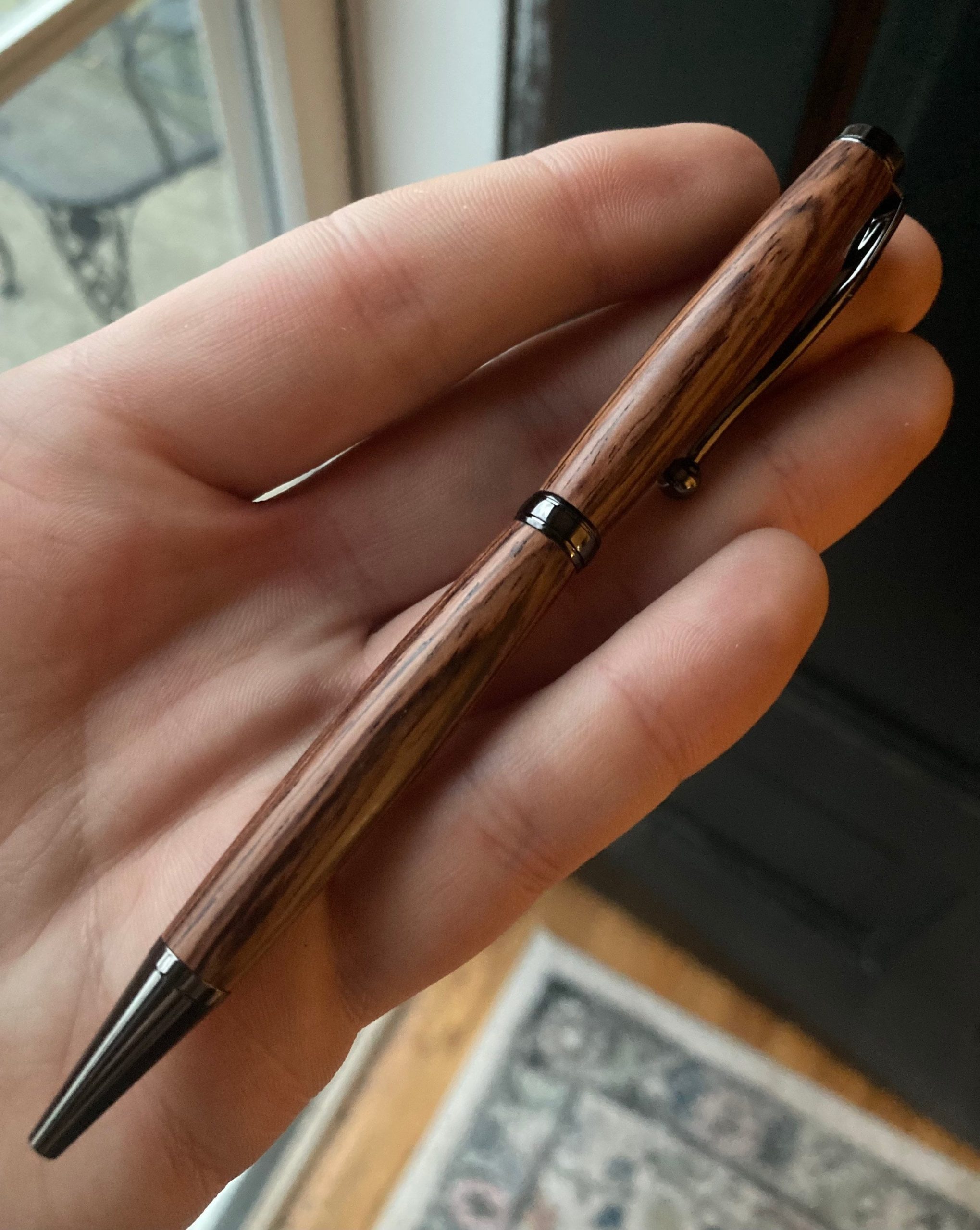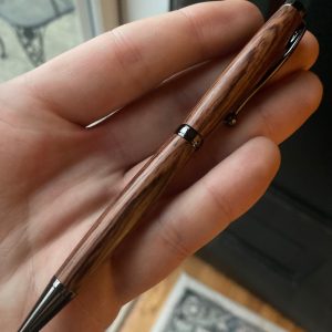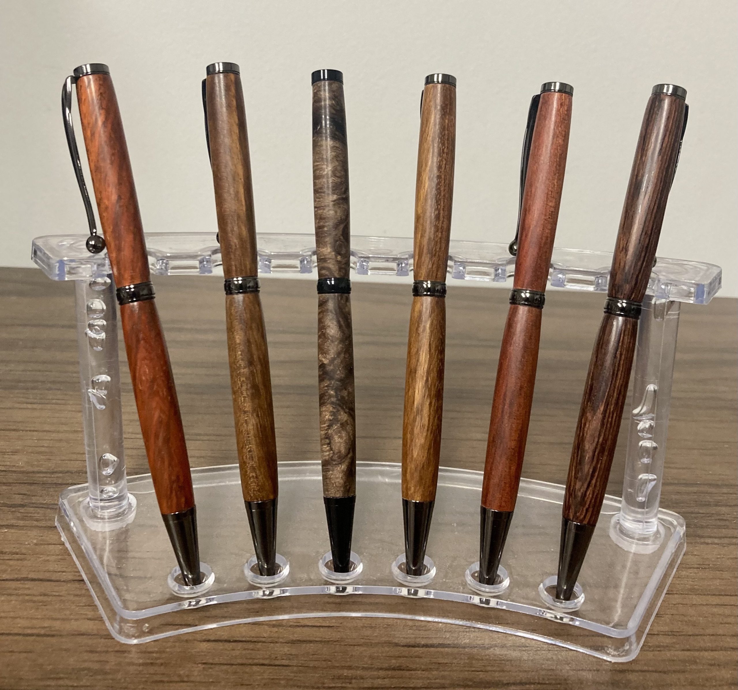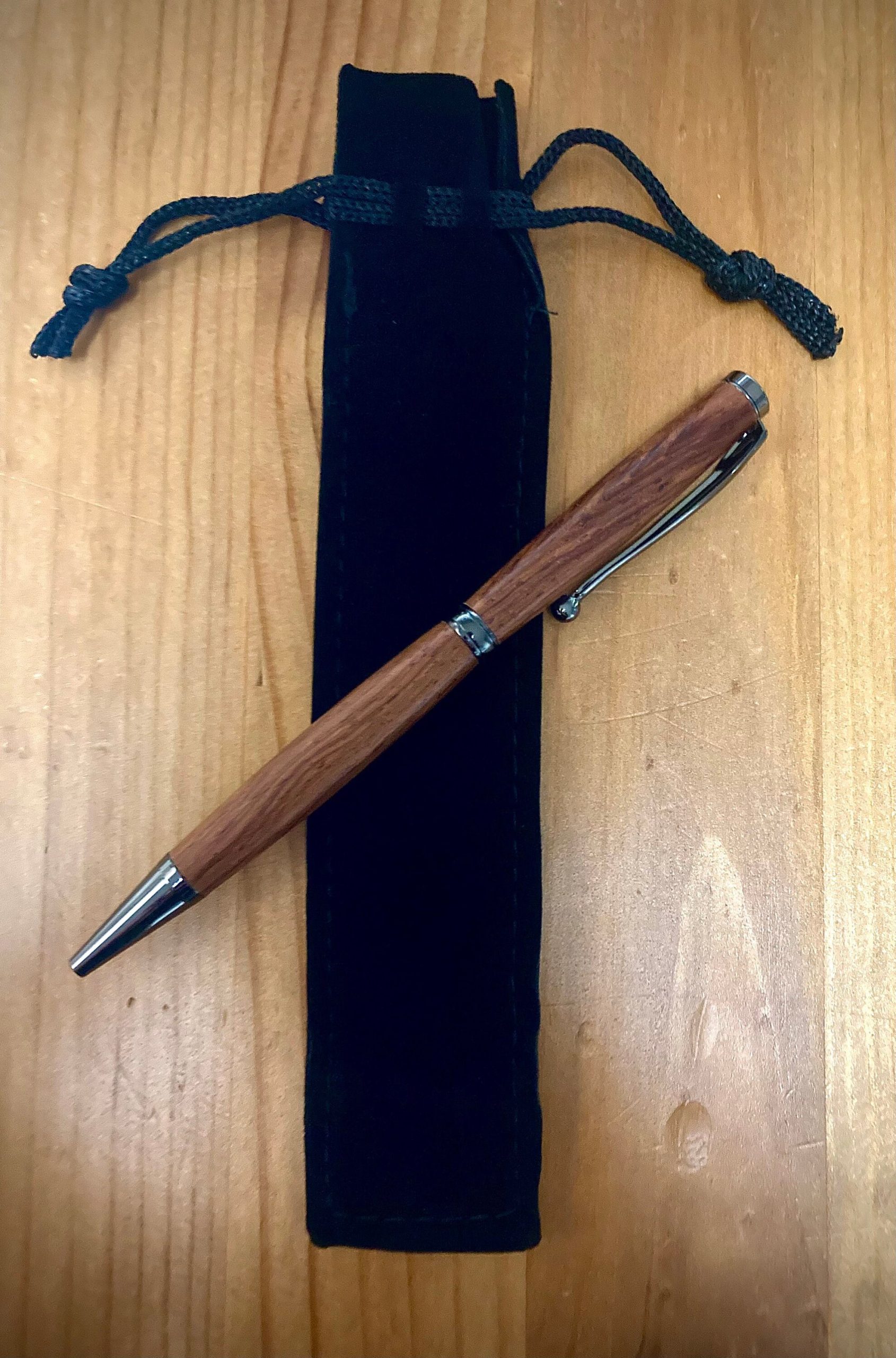 “Each order includes one pen. Crafted from various hardwoods, each pen is hand-turned and finished with a protective wax coating. A velvet drawstring pouch is included with every purchase. Ink refills are readily available online by searching for ‘slimline pen ink refill.'”