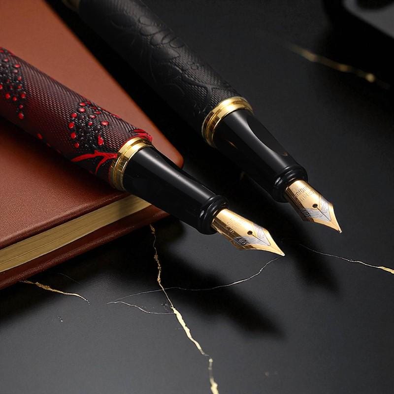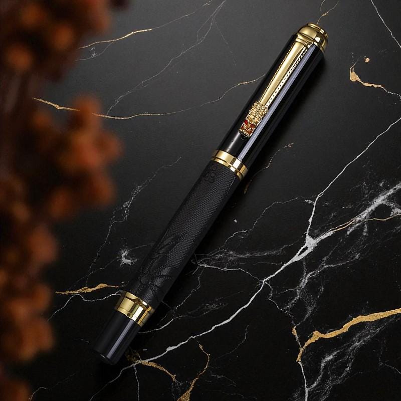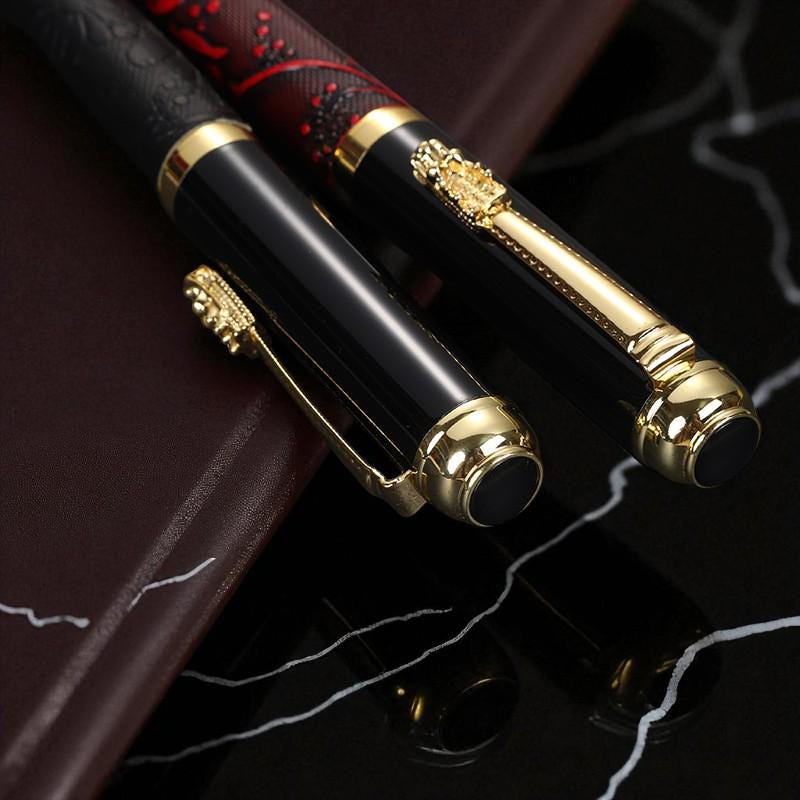 Elevate your writing with this elegantly crafted fountain pen, featuring intricate dragon engravings on a textured barrel. Perfect for collectors, professionals, or as a distinguished gift.